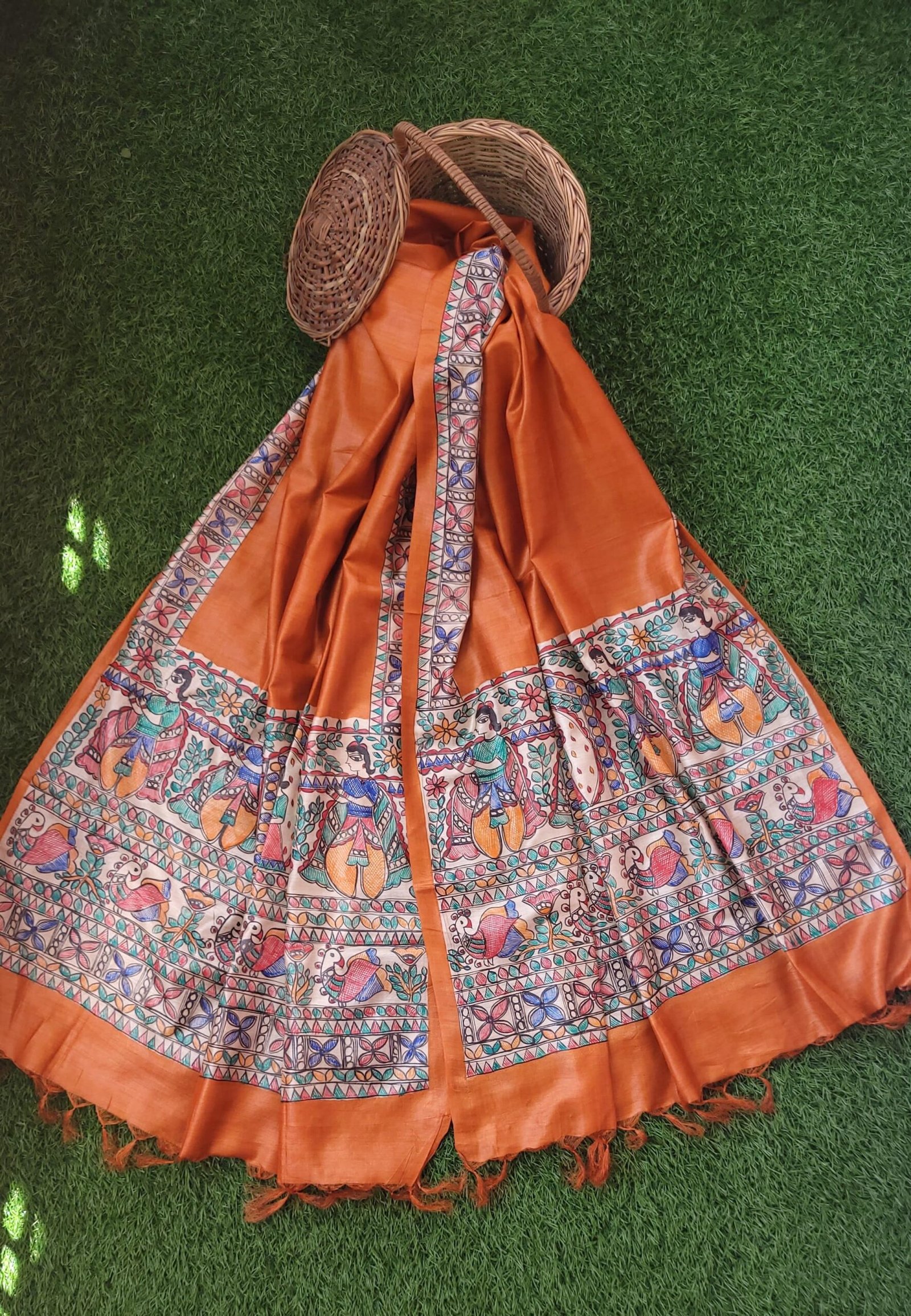 hand painted Madhubani peacock and palki designdupatta with tassels