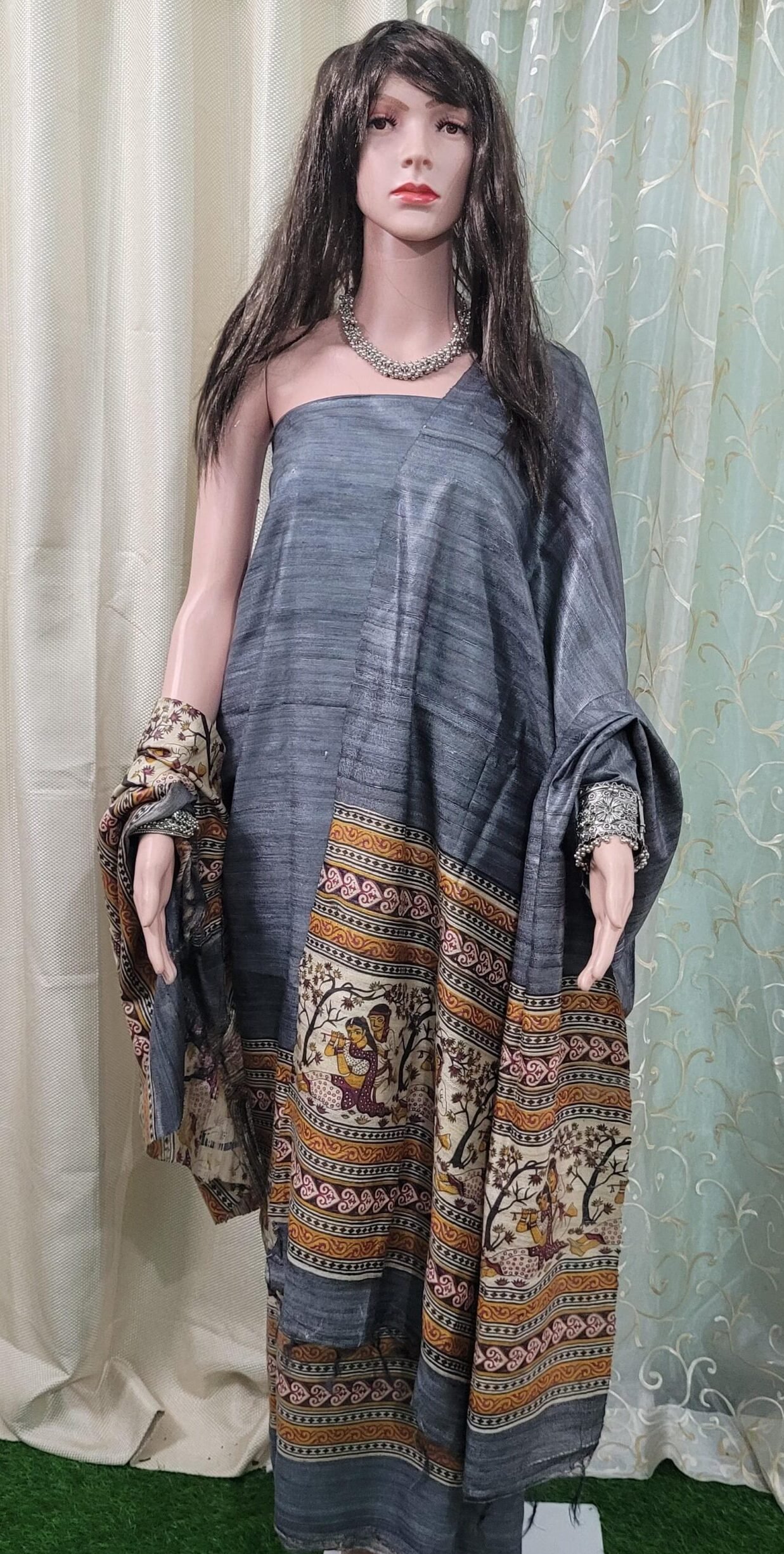 Coordinated Tussar Gheecha Silk Dupatta with matching tribal patterns