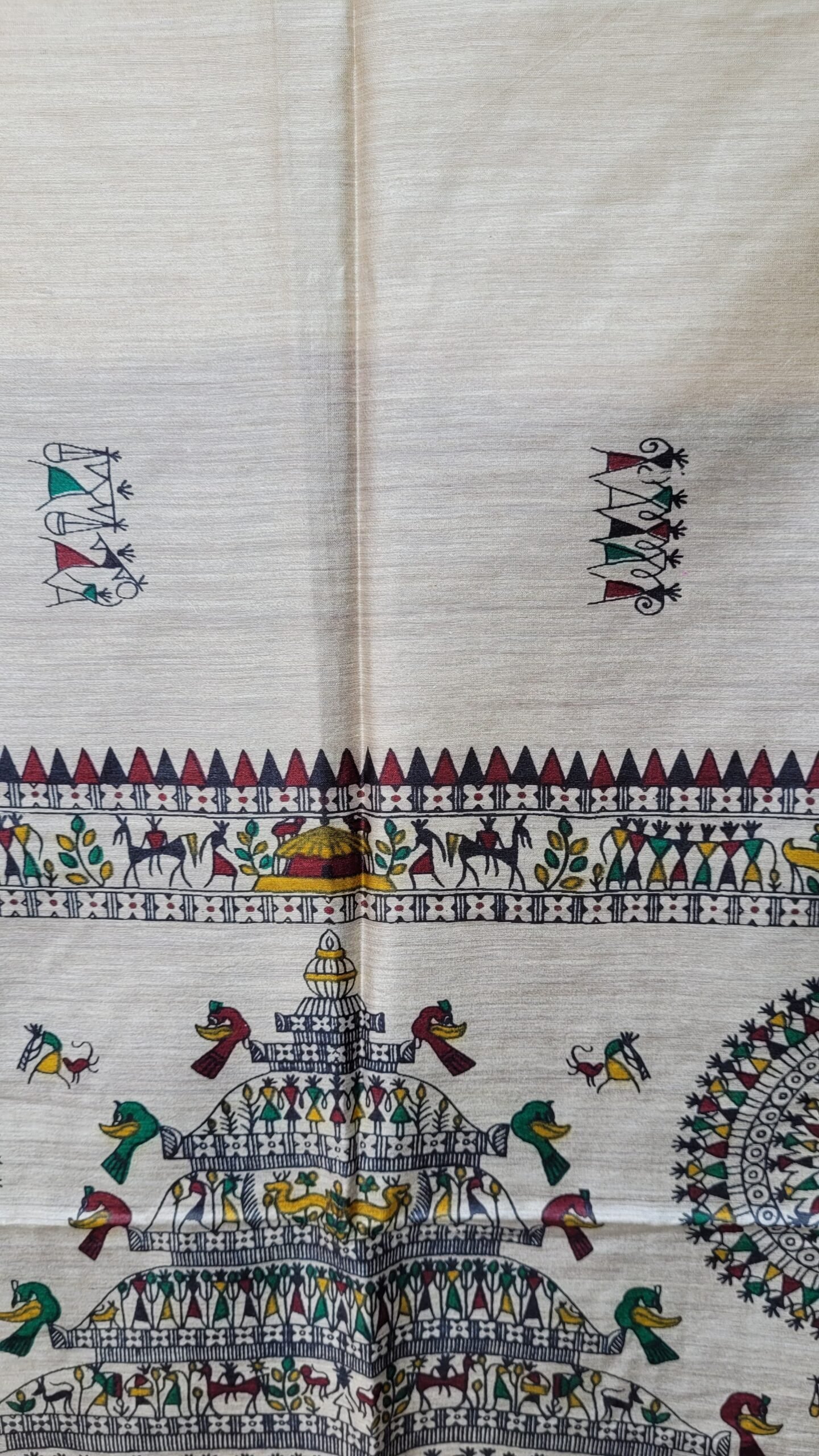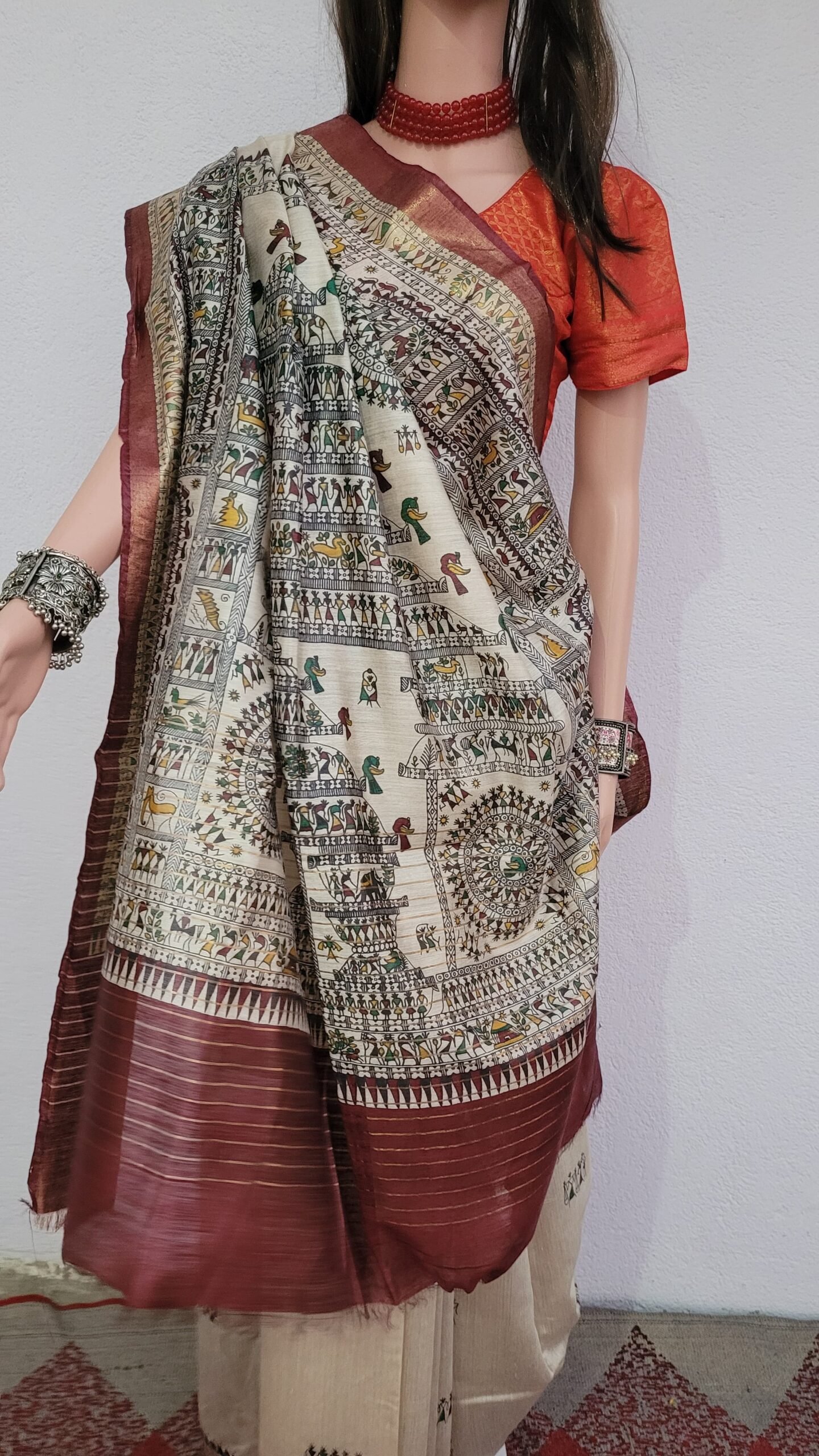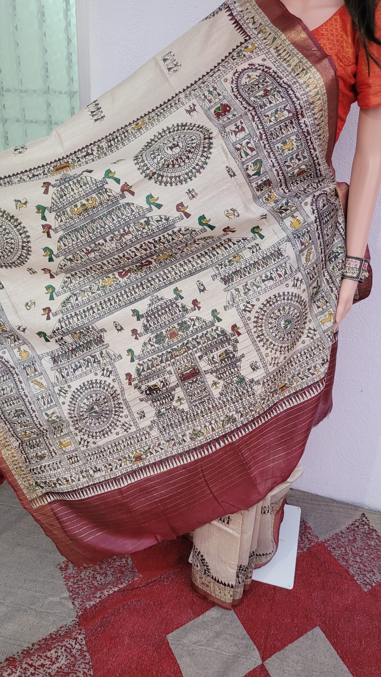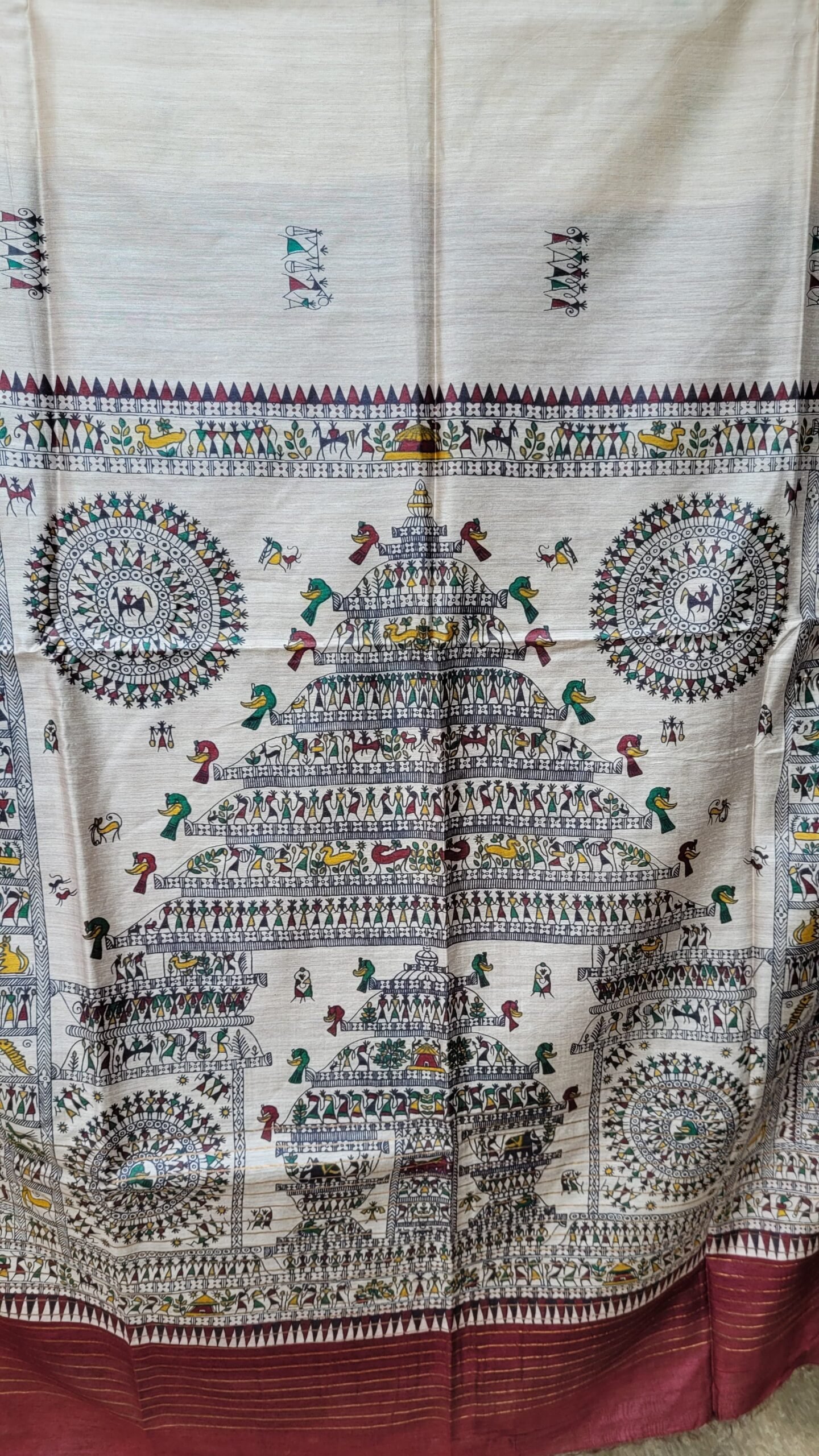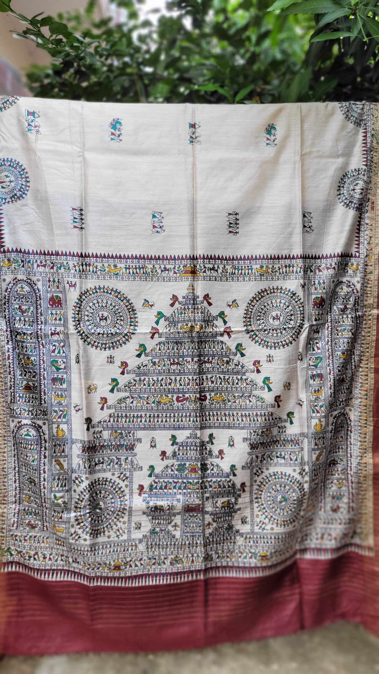 in this beautiful Maroon beige munga tussar silk saree Nature Elements like Trees, and fish are used along with Human Figures: Village life scenes, women are portrayed, symbolizing love, fertility, and daily life.