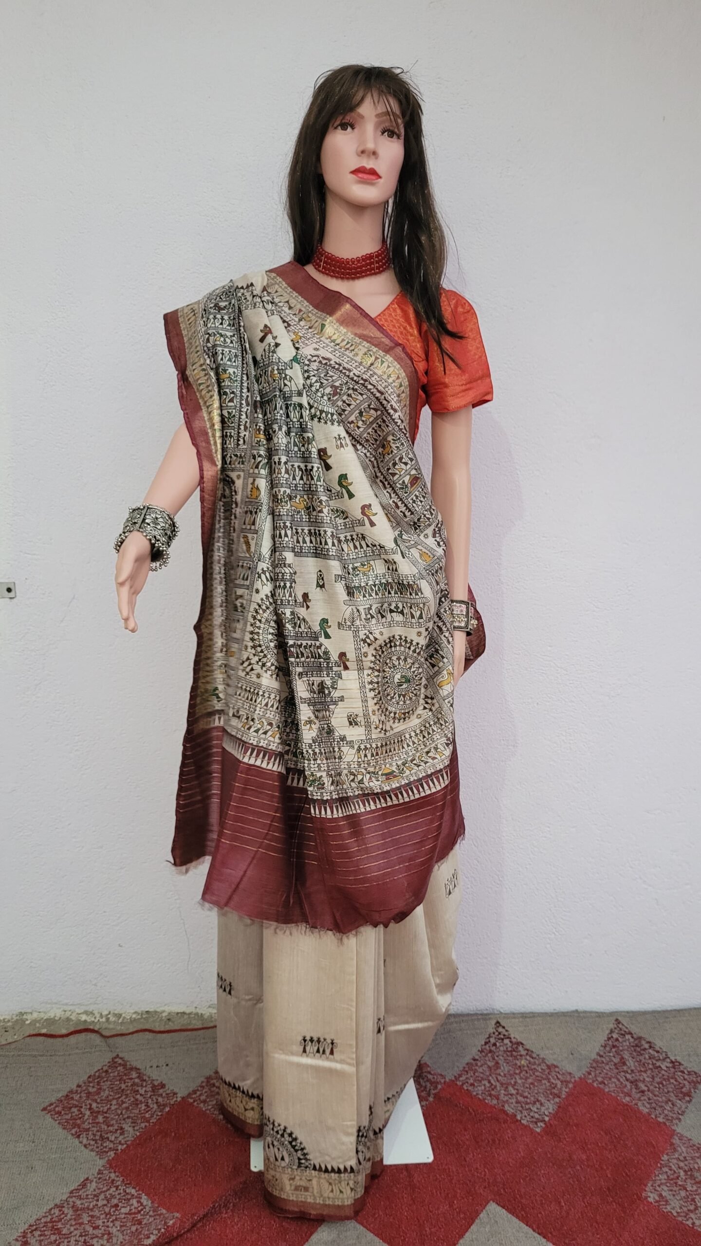 color- Natural beige with maroon border and marron blouse