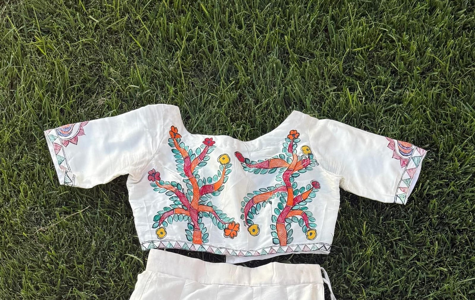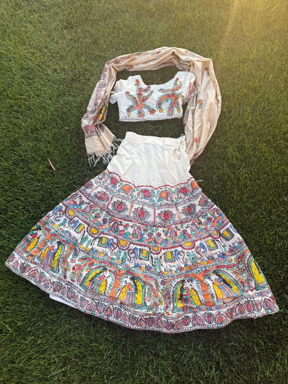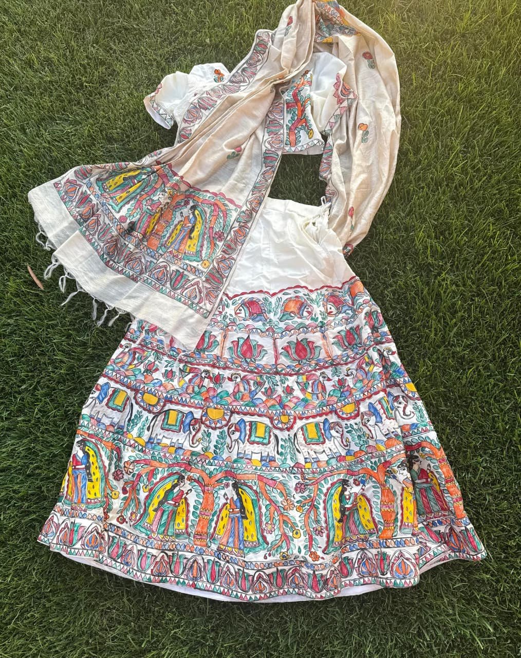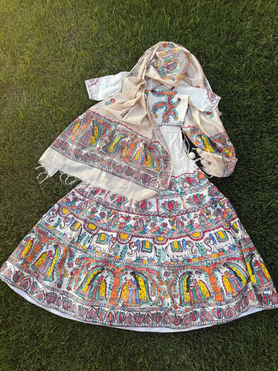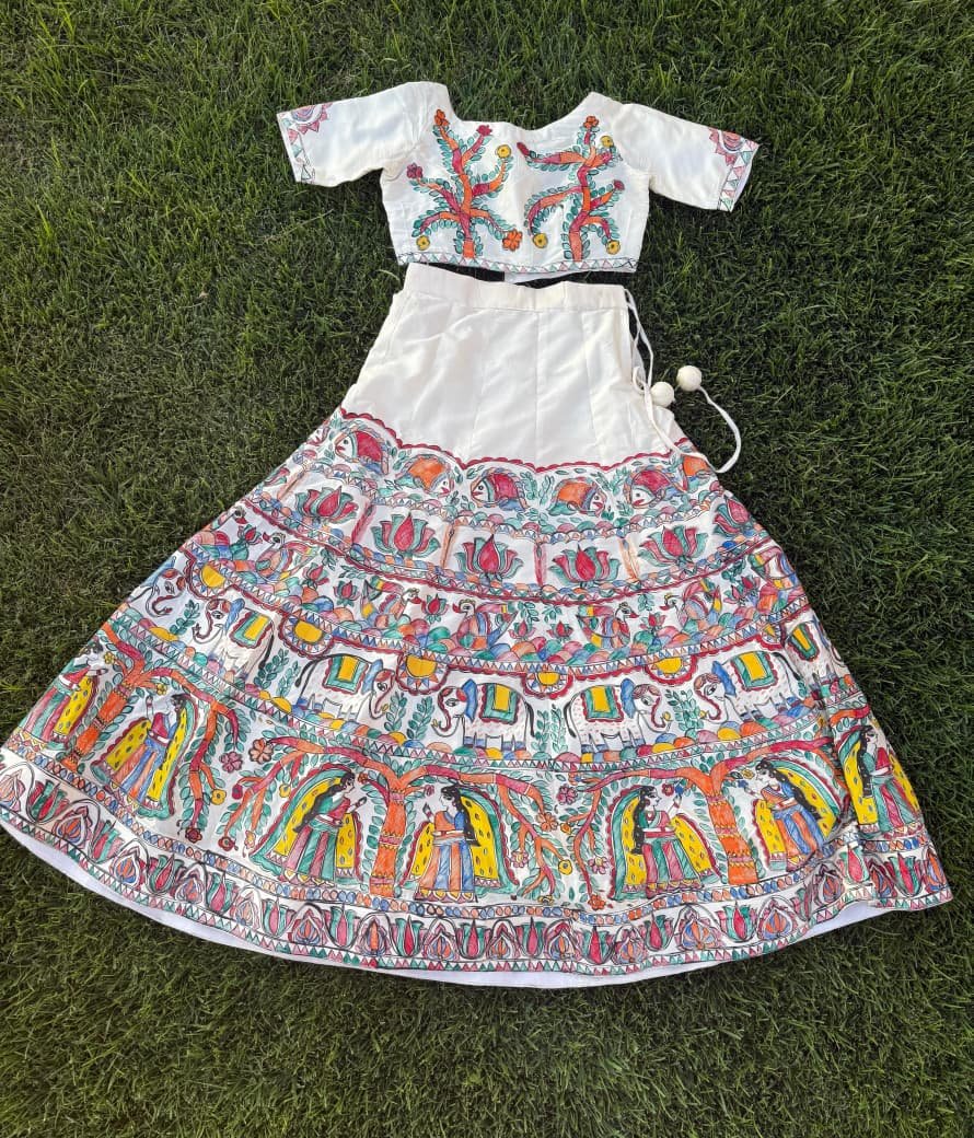 A lehenga that carries the heritage of Mithila, painted on the canvas of pure silk.
